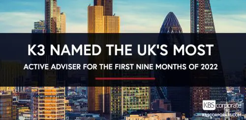 Refinitiv’s Global M&A Mid-Market Finical Advisory Review: First Nine Months 2022 Review has named K3 Capital Group as the UK’s most active adviser.