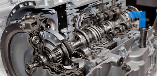 Cross-sectional view of an automatic transmission system showing internal components such as gears, shafts, clutches, and hydraulic circuits.